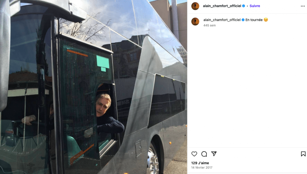 D’ailleurs, le 14 février 2017, Alain Chamfort a partagé fièrement une photo de lui en bus, durant sa tournée. Cette image illustre son quotidien de musicien, entre déplacements et moments de complicité avec ses fans.